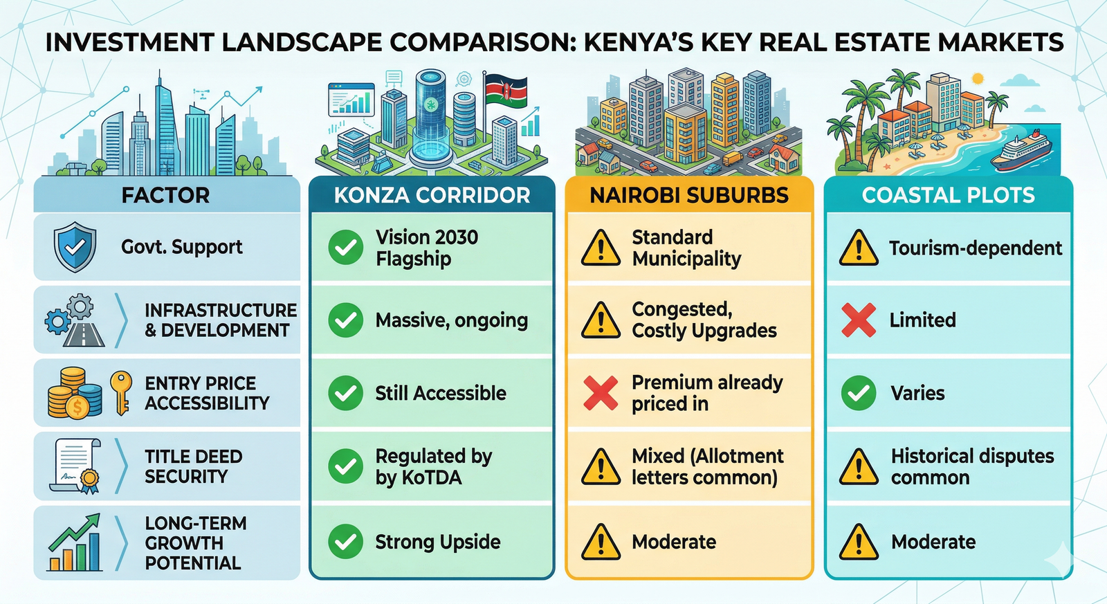 When government commits hundreds of billions to infrastructure in a specific corridor, land values in and around that corridor do one thing: they go up. We have seen this pattern play out in every major city development globally, from Dubai to Shenzhen to Singapore. Konza is Kenya's version of that story, and it is still early.